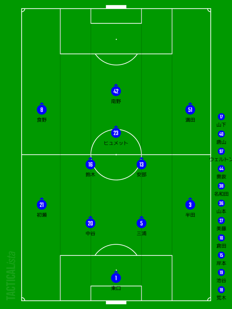(選手交代)46min初瀬→岸本、満田→山下、72min南野→名和田、78min食野→奥抜、90min安部→美藤