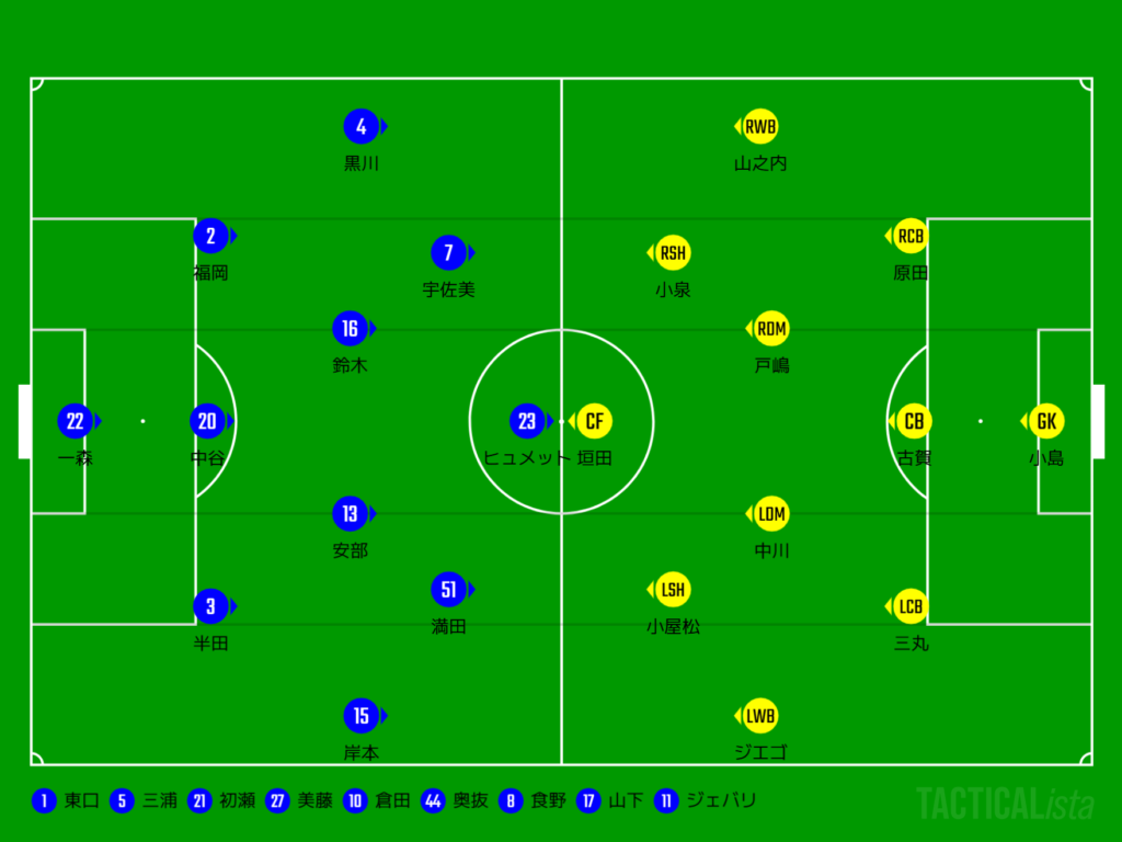 (選手交代)56min宇佐美→ジェバリ、ヒュメット→山下、66min黒川→初瀬、岸本→奥抜、80min鈴木→美藤