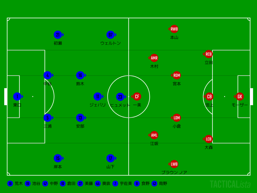 (選手交代)61min鈴木→美藤、ヒュメット→宇佐美、山下→奥抜、67minウェルトン→食野、88min初瀬→中野