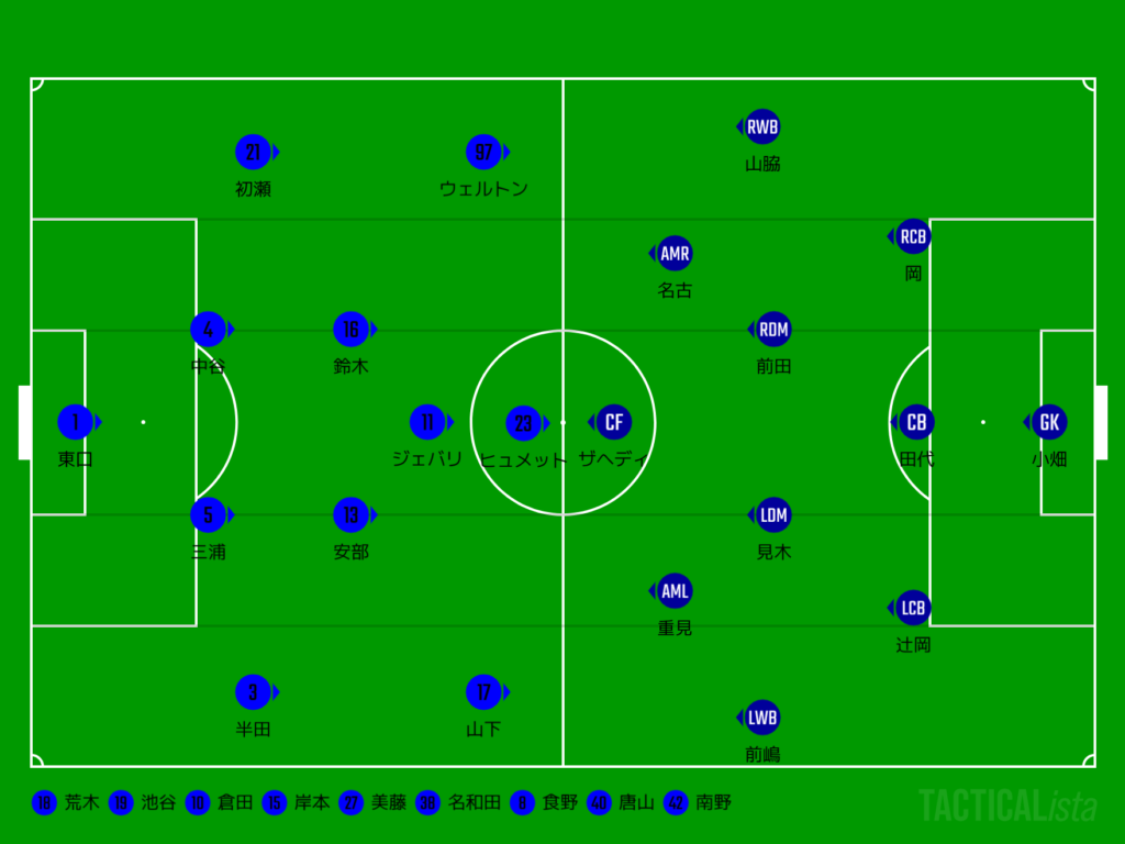 (選手交代)46min初瀬→岸本、ウェルトン→食野、60min安部→美藤、山下→倉田