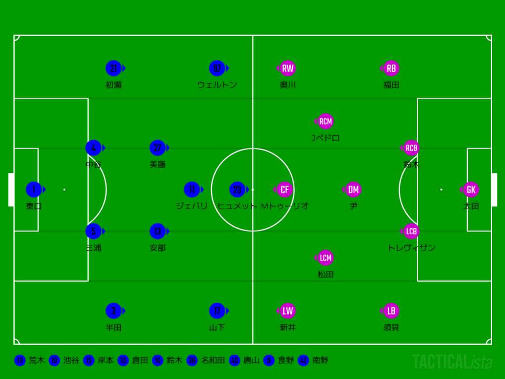 2位の京都に何もさせず完勝。後半のシステム変更にも柔軟に対応し、2点目を取りきってトドメを刺した。 - 開始早々ジェバリがPKを外し嫌な流れになりかけたが、直後の13分、安部のフライスルーに抜け出したヒュメットが、クリアミスを逃さず冷静に流し込み先制!
